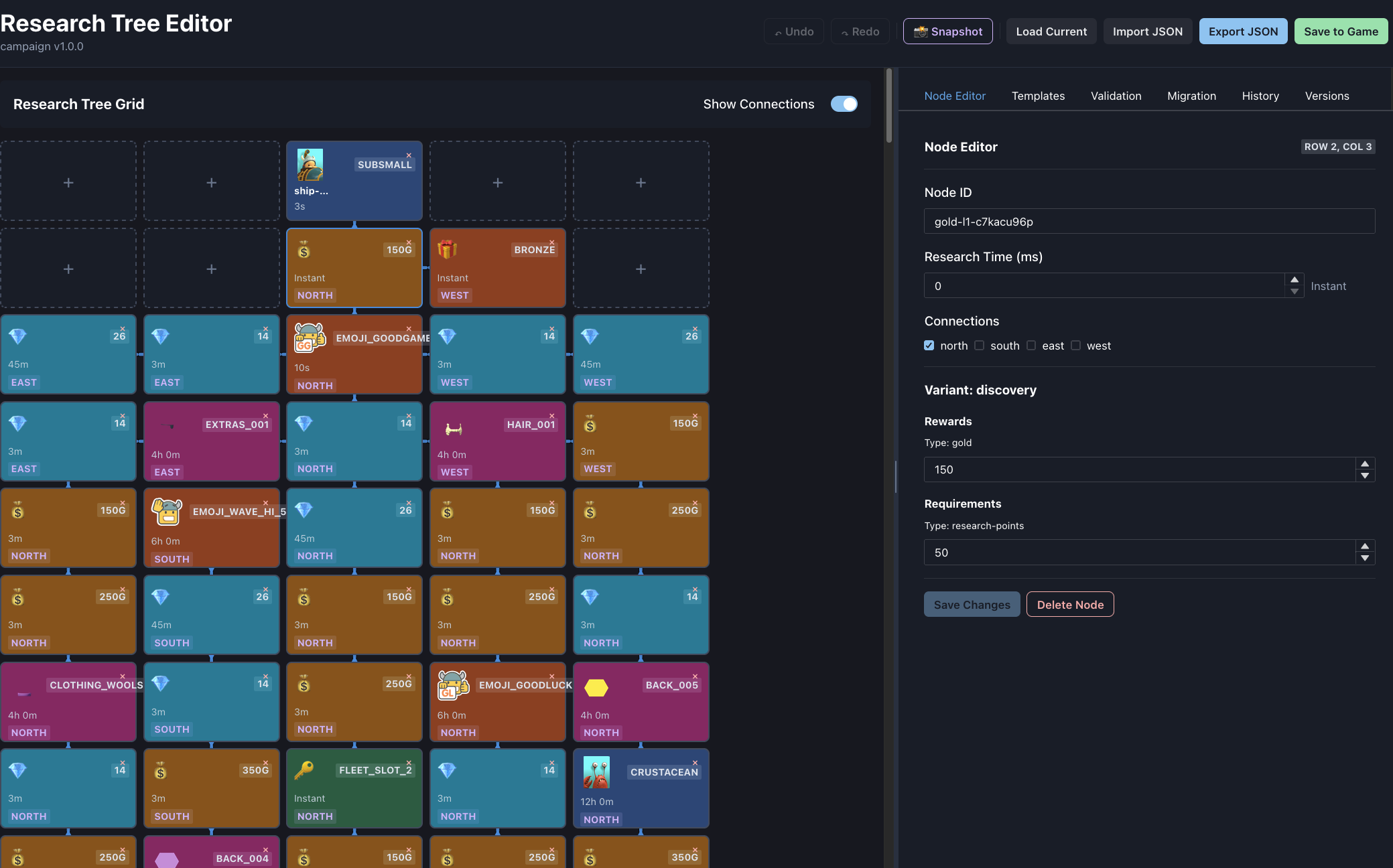 🔹 Research Tree Design Tool Updating the research tree has always been a pain—but I’ve been building a new tool that makes it way easier. This will let us refresh the tree more often, and even roll out seasonal versions.